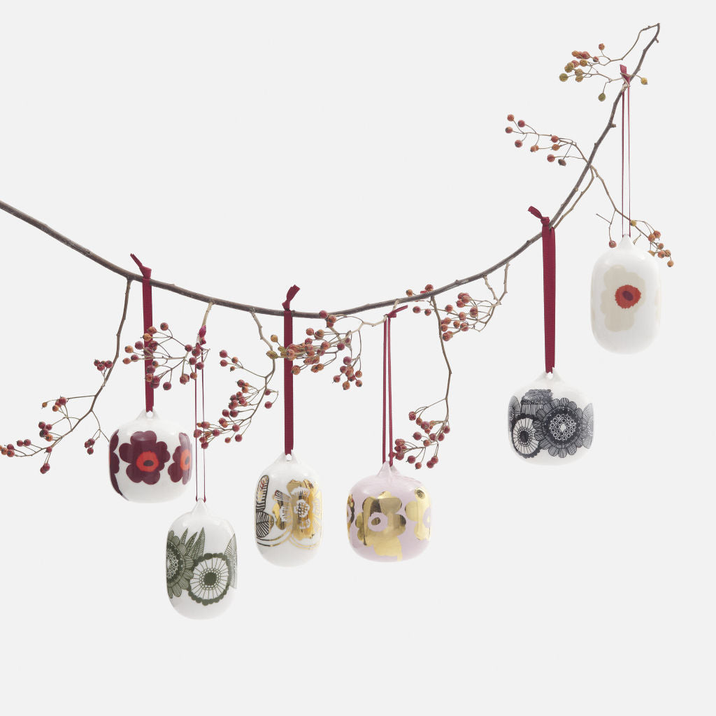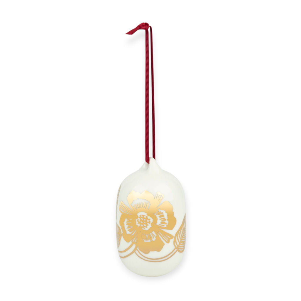 Čudovit keramičen praznični okrasek je izdelan iz bele keramike in okrašen s pozlačenim Tiara vzorcem. Zbirateljski kos je na dnu označen z Marimekkovim žigom in letom proizvodnje.